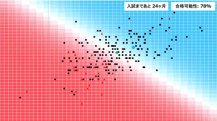 【判定ロジックについて】 本合否判定システムは、過去数年間の膨大な受験生データに基づき、「ロジスティック回帰分析(Logistic Regression)」という多変量解析手法を用いて算出されています。