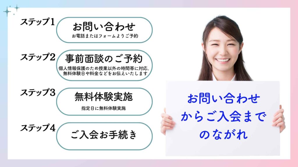 お電話またはフォームより「事前面談のご予約」をお願いいたします。