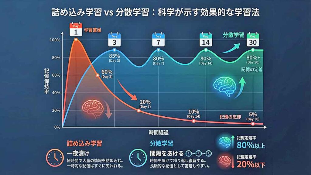 これまでの詰め込み(ブロック学習)から、認知科学に基づいた分散学習(スペーシング:適切な間隔を空けて復習する学習法)へ切り替えることで、効率は劇的に向上します。
