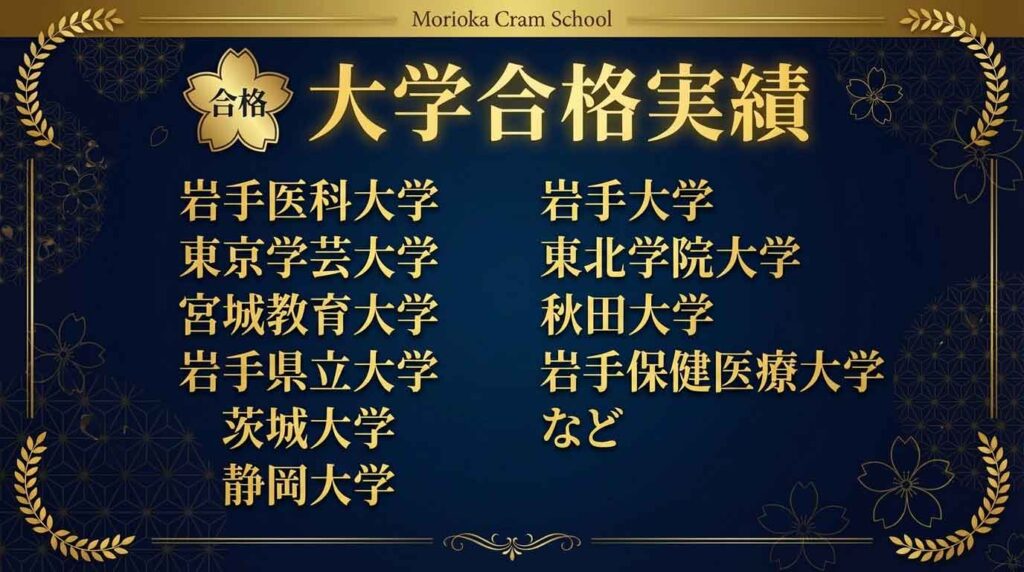 盛岡一高・三高・四高 / 岩手大・県立大・宮城教育大など 当塾生が着実に志望校へ進学しています。