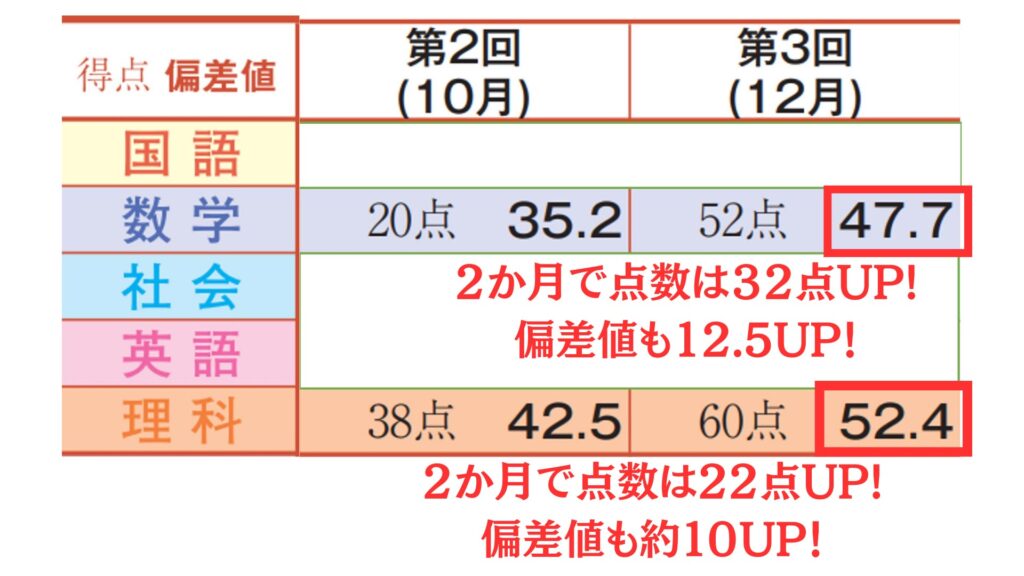今回は、当塾に転塾してわずか2か月で数学の偏差値を35.2から47.7、理科を42.5から52.5まで引き上げた中学生Aさんとそのお母様にインタビューを行いました。転塾を決断した理由や、どのように成績を伸ばせたのかをお伺いしました。以下は成績です。(※成績を保証するものではありません)