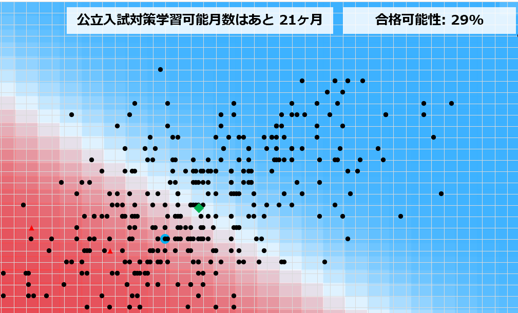 本合否判定システムは、過去数年間の膨大な受験生データに基づき、「ロジスティック回帰分析(Logistic Regression)」という多変量解析手法を用いて算出されています。単なる点数比較ではなく、内申点と偏差値の相関関係を「シグモイド関数」によって確率分布化し、統計的な信頼区間から合格可能性を導き出しています。このヒートマップ(背景グラデーション)は、その数理モデルを可視化したものです。※本データはあくまでも当塾オリジナルの調査に基づくものであり、合否を保証するものではありません。