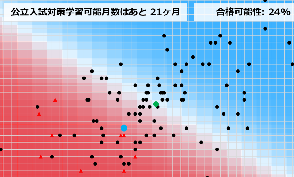 本合否判定システムは、過去数年間の膨大な受験生データに基づき、「ロジスティック回帰分析(Logistic Regression)」という多変量解析手法を用いて算出されています。単なる点数比較ではなく、内申点と偏差値の相関関係を「シグモイド関数」によって確率分布化し、統計的な信頼区間から合格可能性を導き出しています。このヒートマップ(背景グラデーション)は、その数理モデルを可視化したものです。※本データはあくまでも当塾オリジナルの調査に基づくものであり、合否を保証するものではありません。