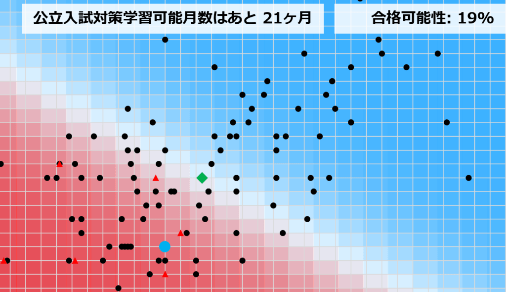 本合否判定システムは、過去数年間の膨大な受験生データに基づき、「ロジスティック回帰分析(Logistic Regression)」という多変量解析手法を用いて算出されています。単なる点数比較ではなく、内申点と偏差値の相関関係を「シグモイド関数」によって確率分布化し、統計的な信頼区間から合格可能性を導き出しています。このヒートマップ(背景グラデーション)は、その数理モデルを可視化したものです。※本データはあくまでも当塾オリジナルの調査に基づくものであり、合否を保証するものではありません。