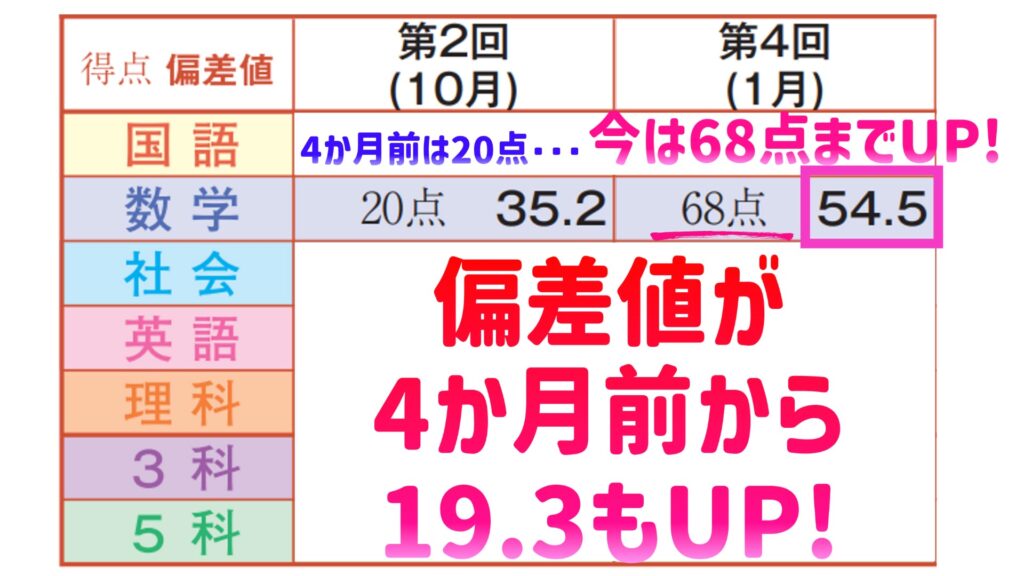 以下は4か月で数学の偏差値を35.2から54.5まで、偏差値を19.3UPした中学3年生の女の子の成績です。